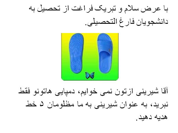 خبر آمد که آغا زن گرفته شکسته بالشو گردن گرفته برای بودن اسمش تو این جمع مثه موش حالت مردن گرفته پیامک داد و فتوا اندرونش بگفتا از سر گیج و جنونش بکن نام مرا از لیست تان حذف و ما دایرکت کردیم به همونش شعر و تنظيم از : شهرام و سيد مرتضي