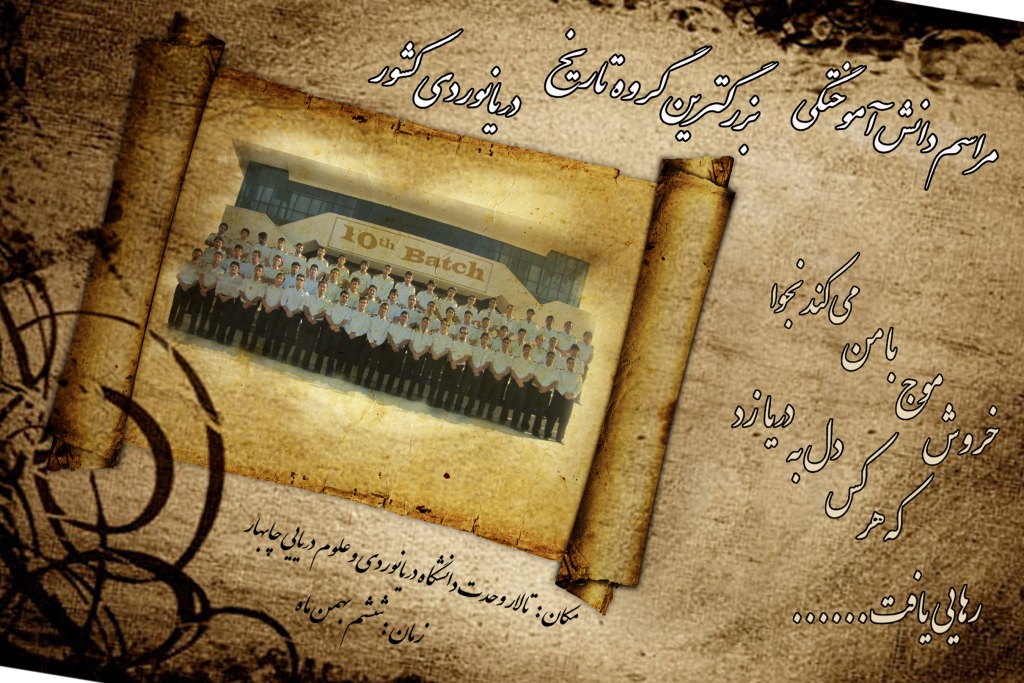 ازاین ورطه رخت خویش ![]() باستحضار دوستان عزیز می رساند مراسم فارغ التحصیلی دانش آموختگان بزرگ ترین گروه تاریخ دریانوردی ایران، گروه 10 مهندسی کشتی و گروه 24 مهندسی دریا ،مورخ 6 بهمن ماه در تالار وحدت دانشگاه دریانوردی و علوم دریایی چابهار برگزار خواهد شد.